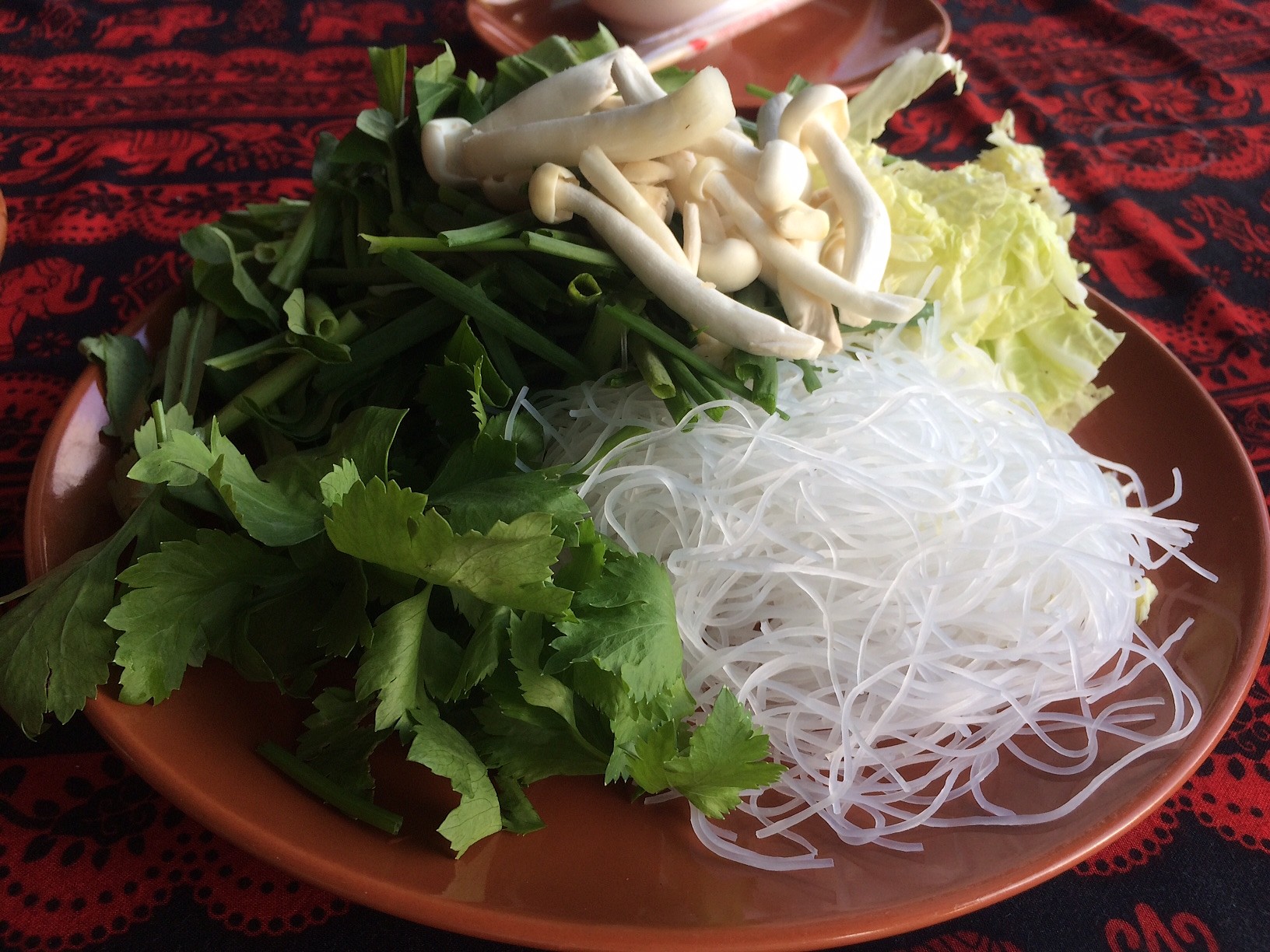 le Jim-Jum est servi avec une assiette de « cheveux d’ange » ( les nouilles quasi translucides), appelés « Wun-Sen » en thaïlandais, des herbes aromatiques comme la coriandre, le basilic ou le céleri, des champignons et les sauces pour accompagner le tout.