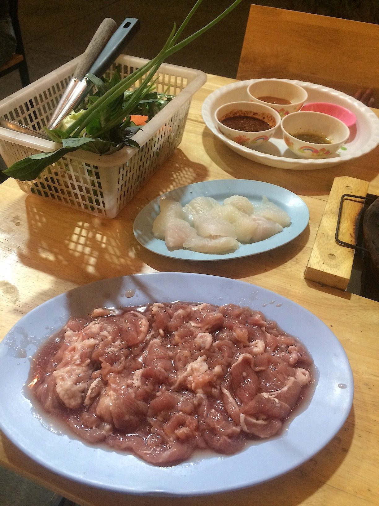 Je vous conseille la version « mix » c’est à dire une assiette regroupant un mélange de viandes crûes (porc, poulet et parfois bœuf) émincées finement avec fruits de mer (crevettes et calamars) ainsi qu’un œuf cru ce qui permet de contenter tout le monde.