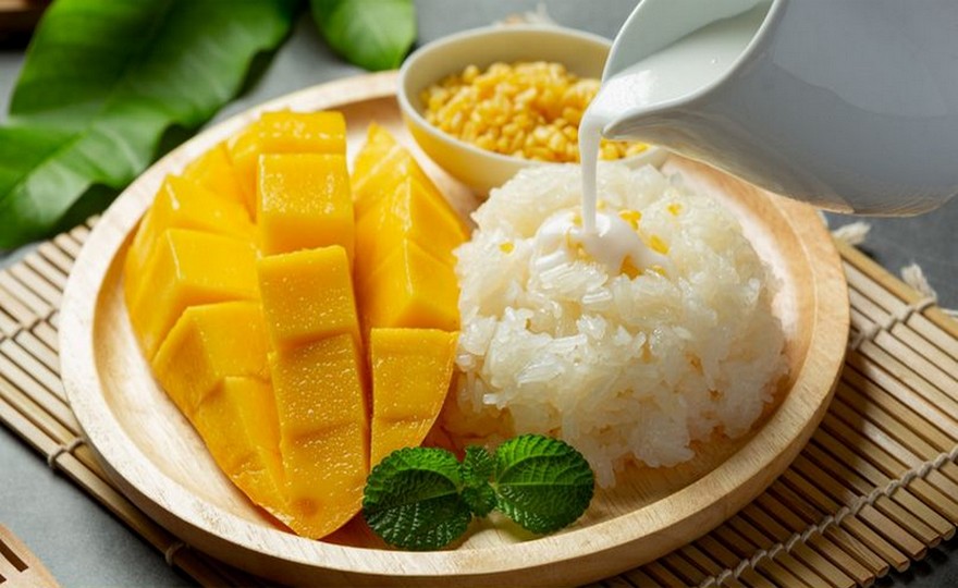 Le riz collant à la mangue est le dessert emblématique en Thaïlande. Le riz gluant est cuit à la vapeur associé à des tranches de mangue sucrée et nappé de lait de coco sucré, garni de graines de sésame grillées, ce dessert sucré et parfumé est le dessert préféré des touristes.