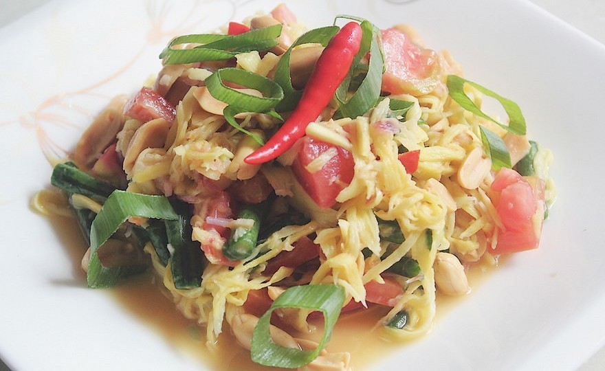 La salade de mangue est un plat rafraîchissant et épicé qui combine la fraîcheur de la mangue verte avec des ingrédients tels que des piments, des arachides, des tomates et du citron vert. Assaisonnée d’une vinaigrette sucrée et salée, cette salade est un accompagnement parfait pour les plats thaïlandais épicés.