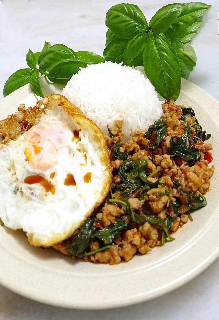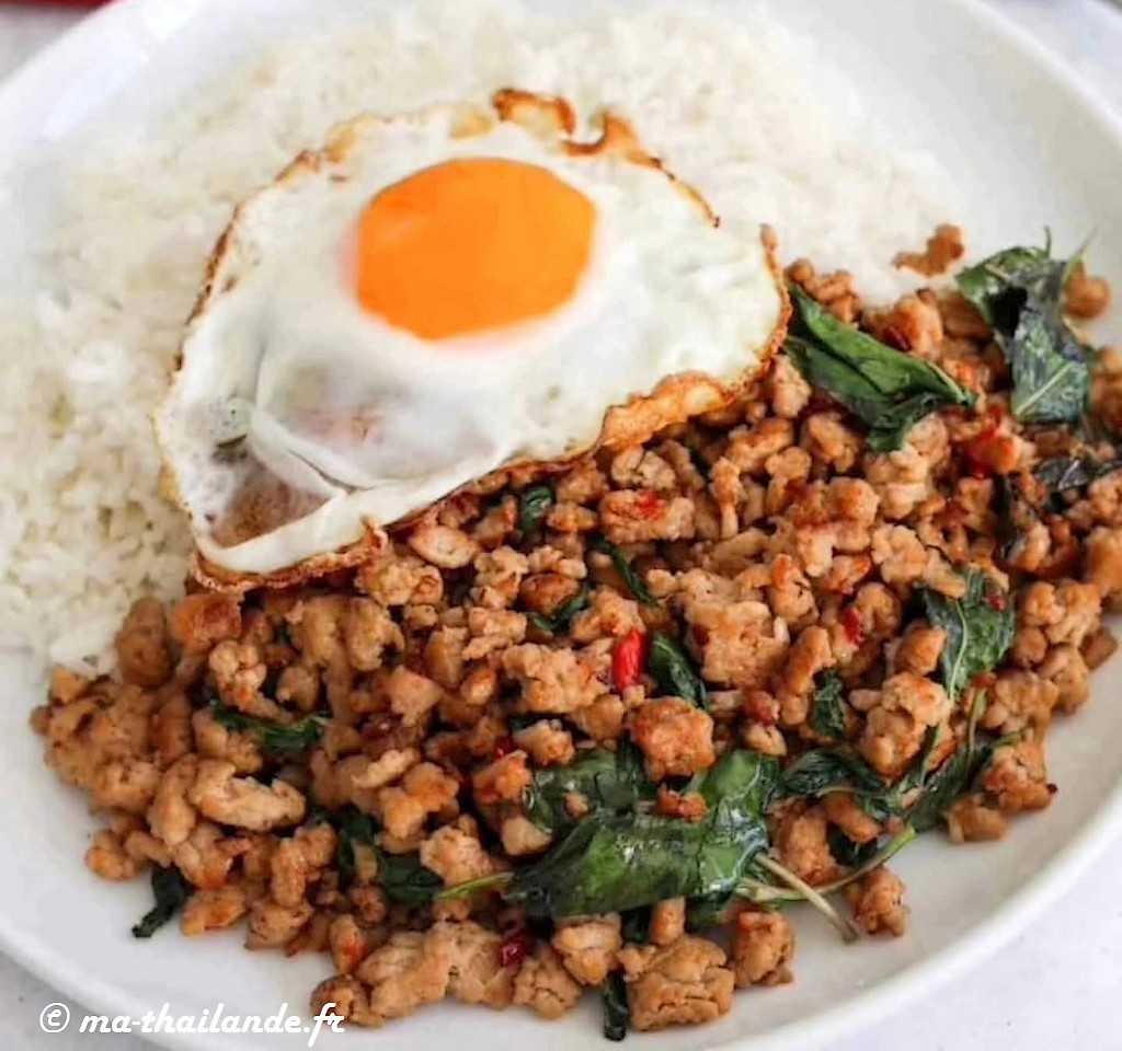 Le Pad Ka Prao, Pad Gaprao ou Phat Kaphrao est l’un des plats emblématiques de la cuisine thaïlandaise, très apprécié aussi bien par les habitants que par les voyageurs. Il s’agit d’un sauté de viande hachée — parfois remplacée par des fruits de mer ou du tofu pour une version végétarienne — parfumé au basilic thaï et relevé d’une sauce sucrée-salée. On le déguste avec du riz et on y ajoute généralement un œuf sur le plat frit sur le dessus.