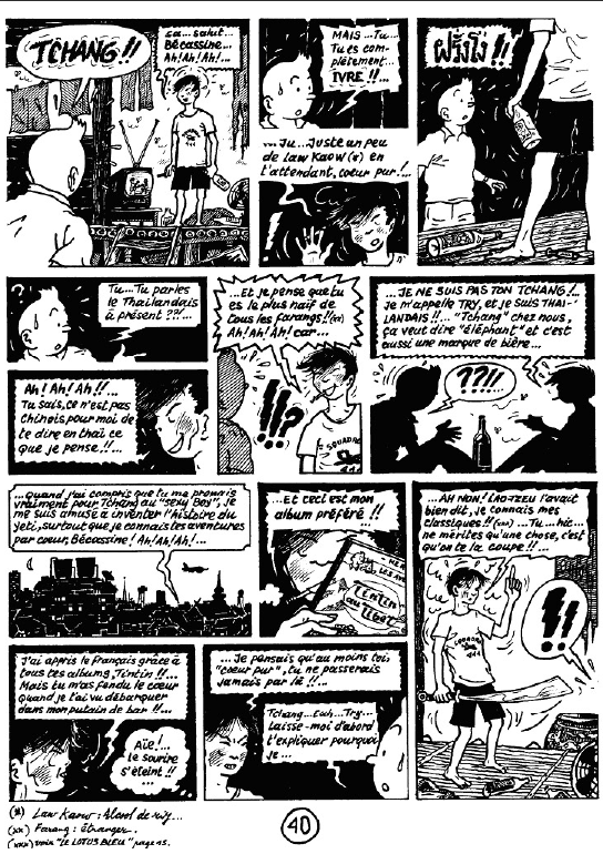Quant à Tintin, toujours intimidé par les choses du sexe, il se risque dans les bars gays de Bangkok pendant que Milou, resté à Moulinsart, en profite pour faire subir les derniers outrages au chat du château..
