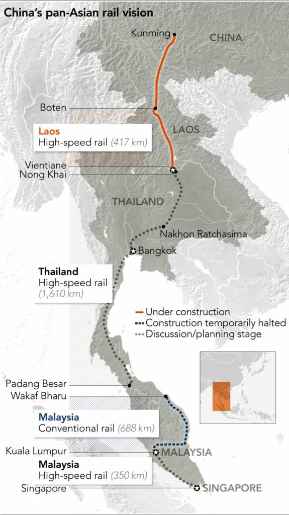 A terme, la ligne ferroviaire chinoise devrait relier la ville de Kunming, dans le sud de la Chine, à Singapour, et se développer simultanément au Laos, au Cambodge, en Birmanie au Vietnam, et bien sûr en Malaisie.
